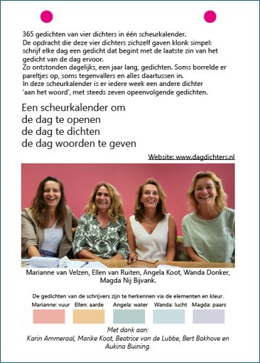 365 gedichten van 4 dichters in 1 scheurkalender. De opdracht die deze vier dichters zichzelf gaven klonk simpel; schrijf elke dag een gedicht dat begint met de laatste zin van het gedicht van de dag ervoor. Zo ontstonden dagelijks, een jaar lang, gedichten, soms borrelden er pareltjes op, soms tegenvallers en alles daar tussenin. Met elkaar hebben we meer dan duizend gedichten geschreven en daaruit een keuze gemaakt voor deze kalender. Elke week een andere dichter “aan het woord” met steeds zeven opeenvolgende gedichten.